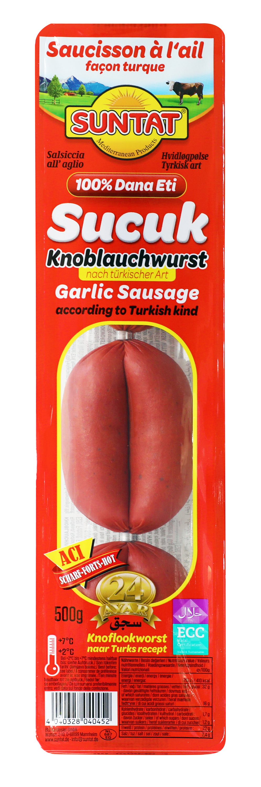 Der SUNTAT Sucuk bringt den authentischen Geschmack der türkischen Küche direkt auf Ihren Tisch. Aromatisch gewürzt und mit intensivem Knoblaucharoma verfeinert, eignet sich diese Wurst perfekt zum Braten, Grillen oder als pikante Beilage. Hergestellt nach Halal-Richtlinien, ist sie die ideale Wahl für alle, die Wert auf hochwertige, traditionsreiche und halal-zertifizierte Produkte legen. Ein echter Klassiker für jeden Anlass!