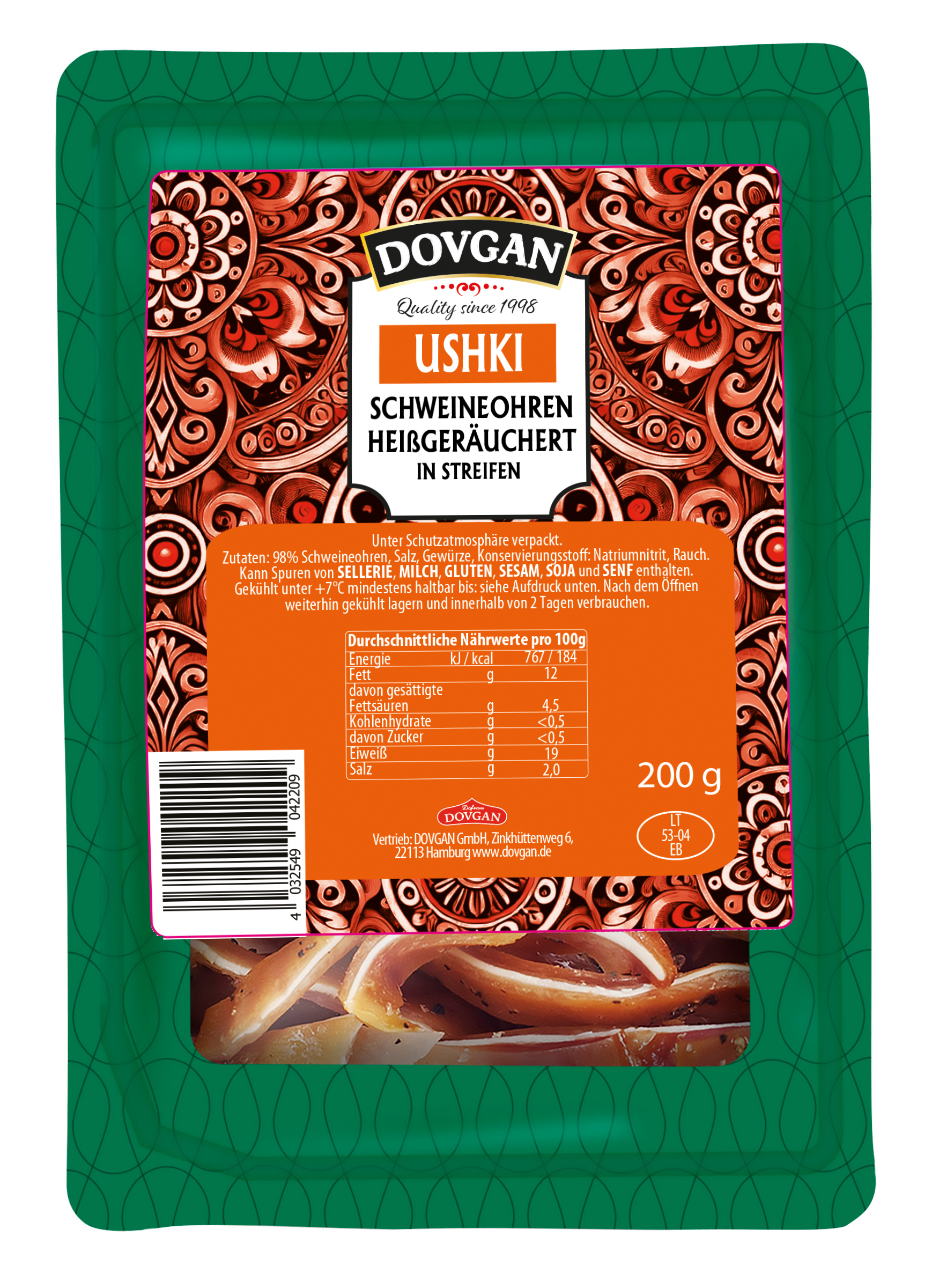 Die DOVGAN Schweineohren Ushki sind eine echte Delikatesse aus Osteuropa und werden traditionell heißgeräuchert. Durch die schonende Zubereitung entsteht ein einzigartig intensives Aroma, das perfekt mit der bissfesten Konsistenz harmoniert. In feine Streifen geschnitten, eignen sie sich hervorragend als Snack zwischendurch, zu Bier oder als herzhafte Ergänzung zu verschiedenen Gerichten.